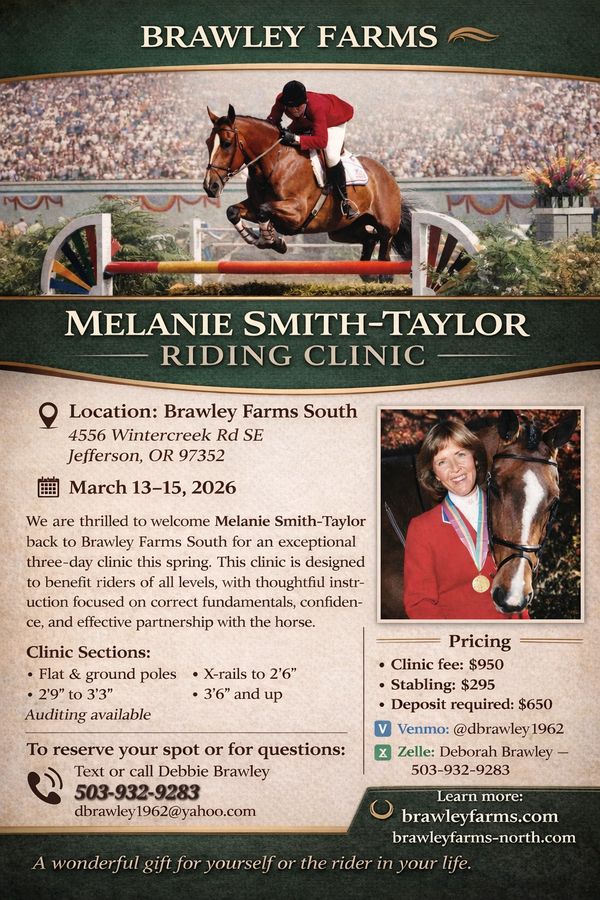 We are thrilled to welcome Melanie Smith-Taylor back to Brawley Farms South for an exceptional three-day clinic this spring. This clinic is designed to benefit riders of all levels, with thoughtful instruction focused on correct fundamentals, confidence, and effective partnership with the horse.